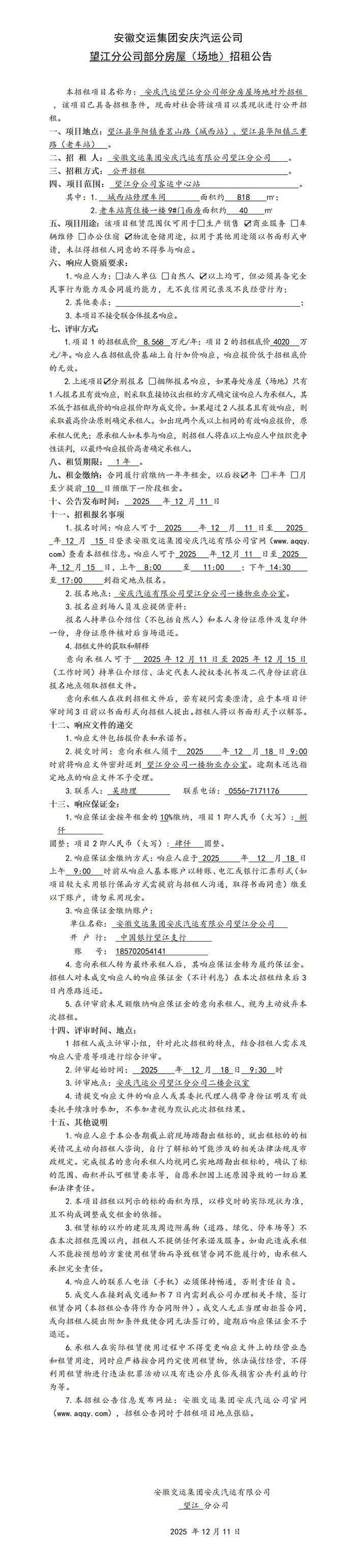望江分公司部分房屋(場地)招租公告